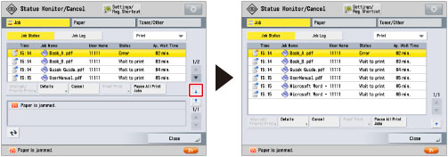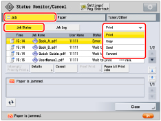 Icons at the left of the screen indicate the job status. For information on the types and details of the icons, see "Icons on the Job Screen." If you select [Print] in job types, the approximate wait time for each job to be processed are displayed. |