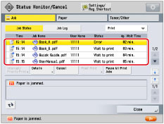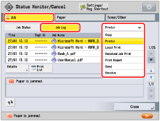 The cancelled job appears as <NG> (No Good) on the Log screen. If the paper specified at the time the job was issued is not available, a message asking you to load the appropriate paper appears. Load the paper, and resume the job. If [Suspended Job Timeout] in [Function Settings] (Settings/Registration) is set to 'On', the job which is suspended because paper was not available for printing is displayed as a suspended job after a specified period of time elapses. To resume printing of the suspended job, load the paper → select the job → press [Details] → [Resume]. |