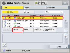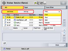 Press [Job] → [Job Status] or [Job Log] → select the job type from the drop-down list.