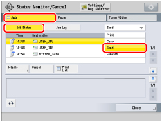 [Resend]: | Resends the job. If you select a job with multiple destinations, press [Broadcast List] → select the destination to resend the job to → press [Resend]. |