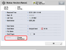 [Change Destination]: | Changes the destination. If you select a job with multiple destinations, press [Broadcast List] → select the destination that you want to change → press [Change Destination]. |
