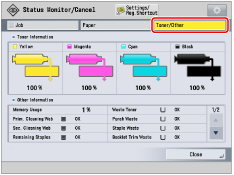 The details of the displayed remaining amount and waste amount of other consumable are shown below. Display | Remaining amount of cleaning web | OK | 100% to 8.5% | Nearly Low | 8.5% to 2.1% | Low | 2.1% to 0% | Empty | 0% |