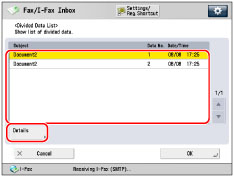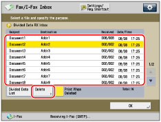 If you delete divided data, it cannot be combined to form a complete file even if the remaining divided data is received later. As the divided data is not valid image data, it will not print correctly. If divided data is deleted while you are setting forwarding settings or the Memory Lock mode for the data, all processes regarding the forced printing of the image are cancelled. |