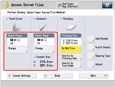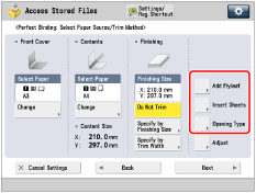 If you set a different paper size for the front flyleaf, back flyleaf, or insert sheets, the paper sizes for the other features are automatically changed to the new paper size. However, changing the paper source for a feature to a source with the same paper size does not change the settings for the other features. Before feeding paper from the Document Insertion Unit-N1, load paper into the Document Insertion Unit-N1 and specify the paper size. To feed paper from the Document Insertion Unit-N1, select [Sheet Inserter 1] or [Sheet Inserter 2]. If paper is being fed from the Document Insertion Unit-N1 for the current job, press [Change Insert. 1 Ppr.] or [Change Insert. 2 Ppr.] to select paper for the sheet insertions. |
