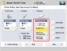 Specify by Finishing Size | Vertical Trim | Width of the Finishing Size + 6.5 mm to 49.5 mm (182.0 mm to 228.6 mm) | Width of the Finishing Size (257.0 mm to 297.0 mm) |