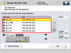 If you press [Details], the detailed information on the selected paper is displayed. If you press , you can switch whether to display the device illustration. For more information, see "Changing the Default Display of Select Paper List Screen ." |
