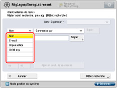 Les catégories de recherche Organisation/Unité organisationnelle peuvent uniquement être utilisées si l'information est répertoriée sur le serveur LDAP. La recherche à partir de l'organisation/unité organisationnelle peut ne pas avoir lieu suivant que les types d'attribut ont ou non été mémorisés sur le serveur LDAP et le type d'application sur ce dernier. |