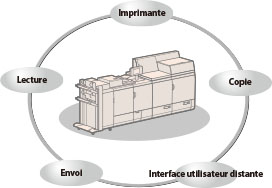 Cette machine est utilisable comme imprimante réseau à grande vitesse. Différents modes d'impression sont disponibles, tels que l'impression recto verso et l'alignement des pages.