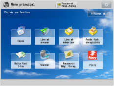 Pour définir les réglages de l'écran Menu principal, se connecter à la machine comme administrateur. Par défaut, les réglages de l'administrateur système (code administrateur système/PIN système) sont définis sur la machine. Par conséquent, l'administrateur doit se connecter en saisissant le numéro d'administrateur système et le PIN système dans l'écran Réglages/Enregistrement. Le réglage par défaut du numéro d'administrateur système et du PIN système est "7654321". Si le nombre de boutons de fonction est supérieur à la valeur définie sous <Réglages affichage bouton menu principal>, les boutons supplémentaires sont affichés sur le deuxième écran du Menu principal. L'écran du Menu principal peut contenir 16 boutons au maximum. Si l'on sélectionne [Afficher tt] dans le Menu principal, tous les boutons sont affichés dans l'ordre par défaut, même lorsque leur disposition a été modifiée. Pour revenir à l'écran personnalisé, appuyer à nouveau sur [Afficher tt]. Pour plus d'informations sur [Changer langue/clavier], voir "Activation/désactivation du changement de langue/clavier". Pour plus d'informations sur [Régl. auto dégradés], [Réglages papier] et [Réglages de gestion du type de papier] voir "Réglage automatique des demi-teintes". "Mémorisation du type et du format de papier d'une source d'alimentation", et "Présentation de cette fonction". Les sauts de ligne utilisés lors de la mémorisation des pages Web sont indiqués dans le nom des boutons de page Web à l'écran Menu principal. |