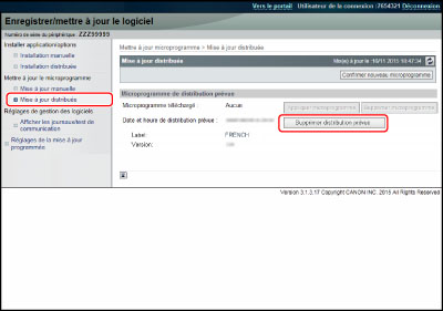 Appuyer sur [Mettre à jour le microprogramme] → [Supprimer la distrib. prévue].