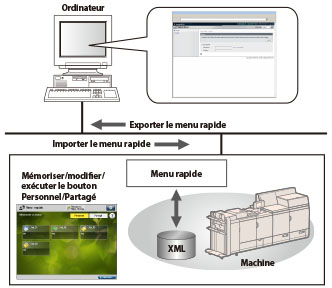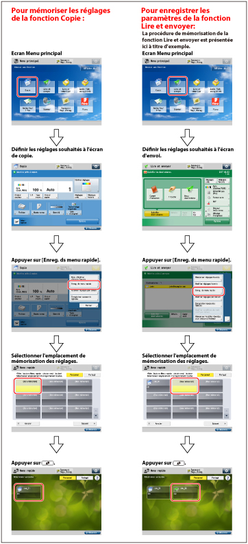 Les réglages par défaut sont utilisés pour tous les réglages de fonction [Copie], sauf les réglages indiqués ci-dessus dans "Contenu de réglage". Pour plus d'informations sur l'enregistrement de réglages sous un bouton personnel/bouton commun, consulter la description de la fonction Lire et envoyer fournie, à titre d'exemple, dans la section "Mémorisation d'un bouton personnel/bouton commun". Pour plus d'informations sur les produits en option nécessaires pour utiliser les fonctions Copie, Lire et envoyer, et Lire et mémoriser, voir "Produits en option requis pour chaque fonction". |