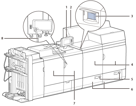 7. | Port réseau Situé dans la partie supérieure gauche du moteur de marquage. Ce port prend en charge 1000/100/10 BASE-T. Utiliser ce port pour connecter la machine au réseau. (imagePRESS Server) |