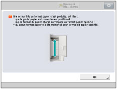 Si un écran s'affiche pour demander de régler les guides coulissants, régler leur écartement → spécifier le format papier → appuyer sur [OK]. ![]() En cas d'erreur, appuyer sur → saisir les valeurs correctes.Pour sélectionner un format de papier mémorisé sous une touche de format ([S1] à [S5]), il convient de mémoriser au préalable le format de papier irrégulier sous la touche de format. Pour plus d'informations sur la mémorisation de formats de papier irréguliers, voir "Mémorisation/modification/suppression des formats de papier personnalisés". |