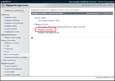Pour spécifier les réglages de transfert, il est nécessaire de se connecter en tant qu'administrateur. |