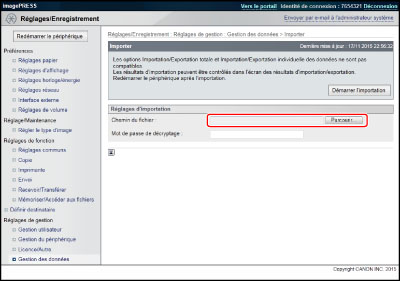 Si l'on importe les réglages de gestion des numéros de service avec la fonction Importer tout, les réglages des informations sur l'administrateur système telles que l'ID ou le mot de passe sont écrasés. Vérifier ces informations sur la machine pour l'exportation avant d'utiliser la fonction Exporter tout, car il faut se connecter à la machine de destination pour pouvoir importer. La fonction Importer tout n'est pas disponible dans les situations ci-dessous : Pendant l'exécution/l'attente d'une tâche (envoi, transfert, réception de I-Fax et impression de rapports, fonctions spécifiées en mode Envoi différé) Pendant une opération Importation/Exportation individuelle Pendant la consultation du carnet d'adresses avec l'interface utilisateur distante depuis une autre machine de la série imagePRESS Pendant la distribution des informations périphérique Pendant l'erreur Sauvegarde des données de boîte aux lettres |