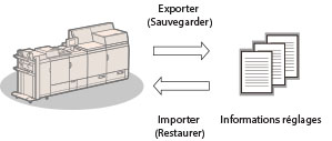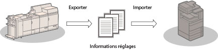 Si vous exécutez la fonction Importer tout dans les cas suivants, les valeurs de paramètre risquent de ne pas être importées ou risquent d'être modifiées à des valeurs similaires. L'équipement en option requis n'est pas installé ou la fonction relative aux informations réglages n'est pas disponible. La valeur de paramètre d'importation n'est pas valide dans la machine du destinataire pour l'importation. |