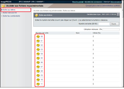 Cliquer sur [Accéder aux fichiers reçus/mémorisés] → sélectionner [Boîte aux lettres] → cliquer sur le numéro de la boîte aux lettres souhaitée.