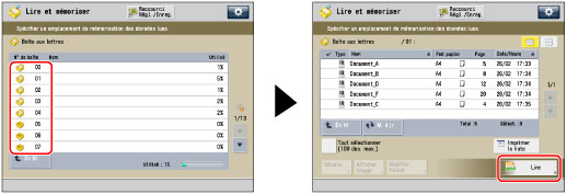 Si les originaux sont placés dans le chargeur, les retirer au fur et à mesure du réceptacle de sortie après la lecture de chaque lot. Il n'est possible de modifier les réglages que pour les fonctions disponibles dans [Changer réglages] lorsque l'on est en mode Lecture continue. Sélectionner les réglages de lecture nécessaires au préalable. |