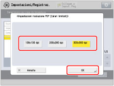 Questa impostazione è valida solo quando il formato del file è impostato su [PDF (Col. limit.)] in "Scansione e invio" o "Scansione e memorizzaz.". Questa impostazione è valida quando è selezionato [Testo] in [Tipo di originale], anche se si seleziona [Priorità qualità] in [Livel. qual. immag.per Colori limit./Compres.]. (Vedere "Livello qualità immagine per compressione alta/colori limitati".) |
