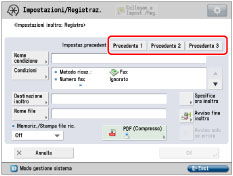 Le ultime tre impostazioni di inoltro registrate in memoria non vengono eliminate anche se si spegne e riaccende la macchina. Le impostazioni di inoltro per i file ricevuti non memorizzati non vengono visualizzate, anche se si preme <Impostaz.precedenti>. |
