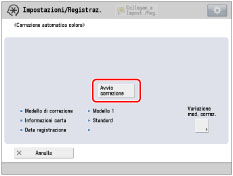 Per correggere il colore utilizzando il modello di correzione registrato premere [Variazione mod. correz.] → selezionare il modello di correzione registrato → premere [OK]. Per maggiori informazioni sul modello di correzione vedere "Registrazione modello di correzione". |