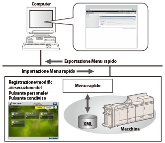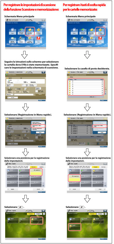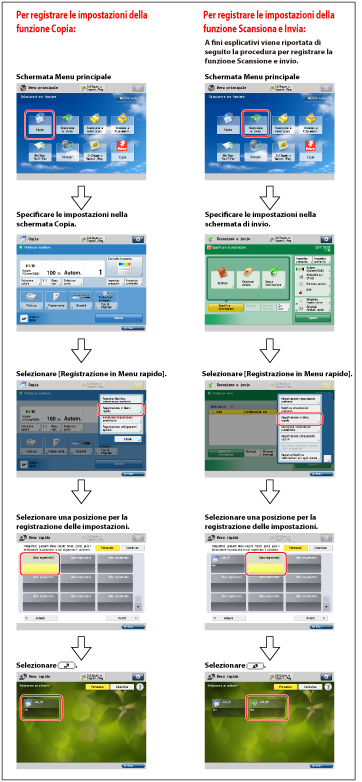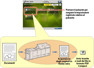 Le impostazioni predefinite vengono utilizzate per tutte le impostazioni della funzione [Copia], tranne le impostazioni indicate in 'Contenuto dell'impostazione' di cui sopra. Per istruzioni sulla registrazione delle impostazioni in un pulsante personale/pulsante condiviso, vedere la spiegazione esemplificativa per la funzione Scansione e invio in "Registrazione di un pulsante personalizzato/pulsante condiviso". Per informazioni sui prodotti opzionali necessari per l'utilizzo delle funzioni Copia, Scansione e invio e Scansione e memorizzazione, vedere "Prodotti opzionali necessari per ciascuna funzione". |