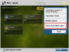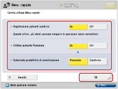 Solo il gestore del sistema può configurare le impostazioni di limitazione dell'accesso al Menu rapido. Per informazioni sull'amministratore, vedere "Impostazioni amministratore". Se non è impostata la Gestione ID divisione, i pulsanti personali non saranno visualizzati. |