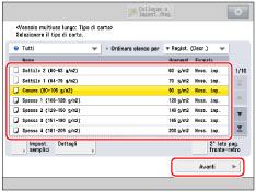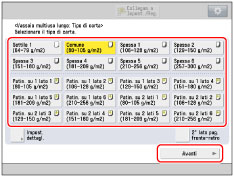 Per maggiori informazioni sui tipi di carta, vedere "Carta/supporti utilizzabili". È possibile registrare tipi di carta diversi da quelli elencati in Impostazioni dettagliate per la selezione del tipo di carta. Per informazioni sulla registrazione di un tipo di carta personalizzato, vedere "Registrazione dei tipi di carta personalizzati". |