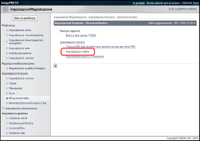 È inoltre possibile specificare impostazioni di inoltro dal pannello comandi premendo [Impostazioni funzione] (Impostazioni/Registrazione) → [Ricezione/Inoltro] → [Impostazioni comuni] → [Impostazioni inoltro]. Per istruzioni sull'utilizzo del pannello comandi per specificare le impostazioni di inoltro, e per ulteriori informazioni sulle impostazioni di inoltro, vedere "Ricezione/Inoltro". |