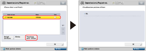 Le coppie di chiavi per cui 'Utilizzo' viene visualizzato in <Stato> non possono essere eliminate perché sono in uso con l'autenticazione IEEE802.1X/IPSec o perché SSL è impostato su 'On'. Premere [Visualizzaz. posiz. utilizzo] per controllare il tipo di protezione per cui è utilizzata la coppia di chiavi. Per eliminare una coppia di chiavi utilizzata solo con SSL, specificare le seguenti impostazioni su 'Off'. Una coppia di chiavi utilizzata per l'autenticazioneIEEE802.1X/IPSec non può essere eliminata. <Utilizzo SSL> in [IU remota] (per ulteriori dettagli, vedere il manuale fornito con l'imagePRESS Server). <RX SMTP> in [Impostazioni e-mail/I-Fax] (Vedere "Impostazioni e-mail/I-Fax".) [Limite ricezione per ogni funzione] in [Impostazioni distribuz.informazioni periferica] (Vedere "Registrazione/cancellazione/stampa delle destinazioni a cui distribuire le informazioni".) |