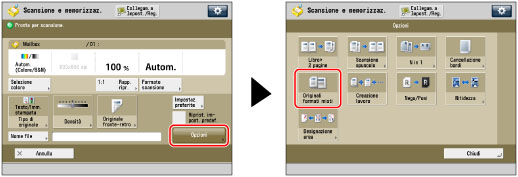Se Formato scansione è impostato su una voce diversa da [Autom.], tutti gli originali vengono acquisiti nel formato specificato. Se si desidera acquisire ciascun originale nel proprio formato originario, assicurarsi che Formato scansione sia impostato su [Autom.]. Gli originali di diverso formato posizionati nell'alimentatore devono avere la stessa grammatura (stesso tipo di carta). Impostando il modo Originali formati misti, la velocità di scansione potrebbe essere inferiore rispetto al normale. |