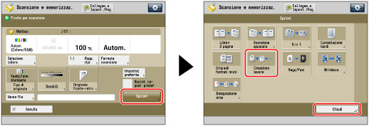 Se si posizionano gli originali nell'alimentatore, rimuoverli dall'area di consegna al termine della scansione di ogni gruppo. Possono essere variate solo le impostazioni visualizzate in [Variaz. impost.] nel modo Creazione lavoro. Specificare in anticipo le impostazioni di scansione necessarie. |