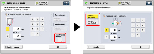 Premere [X] e [Y] → utilizzare i tasti numerici per immettere il formato di scansione espresso in mm → premere [OK].