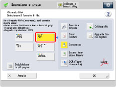 → [Scansione e invio] → specificare la destinazione → premere il pulsante del formato del file.