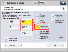 Se il formato di file è PDF, è possibile ridurne le dimensioni utilizzando la funzione [Colori limitati]. Per ulteriori informazioni, vedere "PDF Colori limitati". |