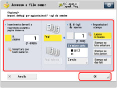 Possono essere inseriti un massimo di 100 fogli di separazione o di divisori di capitolo. Se si utilizza carta già stampata (ad esempio con il logo dell'azienda) per i fogli da inserire, selezionare [Lascia in bianco]. In caso contrario, la macchina stamperà sul foglio prestampato. Il paper deck già specificato come fonte alimentazione carta non può essere selezionato in modo Selezione automatica della carta. |