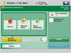 È possibile specificare ed effettuare l'invio a max. 256 destinazioni contemporaneamente. Tuttavia, se viene specificato un gruppo di indirizzi per la destinazione, ciascun indirizzo di quel gruppo viene contato come una destinazione. Se si tenta di inviare a un file server in cui [Conferma prima di invio] è impostato su 'On', viene visualizzata una schermata che richiede di immettere la password del file server. In questo caso, immettere la password del file server. Per registrare un file server in un indirizzo di gruppo, impostare 'Off' per [Conferma prima di invio]. Non è possibile effettuare l'invio ad un indirizzo di gruppo che comprende un file server in cui [Conferma prima di invio] è impostato su 'On'. (Vedere "Registrazione di un indirizzo di file server".) Per cancellare automaticamente dopo l'invio il documento selezionato, selezionare [Eliminaz. file dopo invio]. Non è possibile stampare o memorizzare il documento in un'altra mailbox mentre è in corso l'invio. Se la destinazione selezionata e un indirizzo di gruppo contenente una mailbox, il file non verrà inviato (né memorizzato) alla mailbox specificato. Le destinazioni registrate nei pulsanti di selezione veloce nel menu rapido della macchina client non vengono aggiornate anche se quelle registrate nei pulsanti di selezione veloce di una macchina server vengono aggiornate. Se l'invio non riesce, confermare che la destinazione non sia obsoleta. |