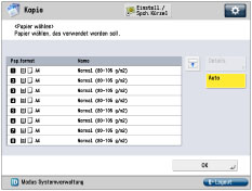 Berühren Sie nacheinander die Tasten [Präferenzen] → [Einstellungen Anzeige] → [Anzeige Bildschirm Papierliste ändern].