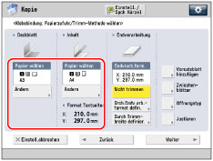 Wenn Sie ein unterschiedliches Papierformat für Vorsatzblatt, hinteres Vorsatzblatt oder Zwischenblätter festlegen, werden die Papierformate für die anderen Funktionen automatisch auf das neue Format geändert. Das Ändern des Papierzufuhrmediums für eine Funktion auf ein Papierzufuhrmedium mit demselben Papierformat ändert allerdings nicht die Einstellungen für die anderen Funktionen. Vor dem Zuführen von Papier aus der Zuschiesseinheit N1 legen Sie Papier in die Zuschiesseinheit N1 ein, und geben Sie das Papierformat an. Zum Zuführen von Papier aus der Zuschiesseinheit N1 wählen Sie [Deckblatteinz.1] oder [Deckblatteinz.2] aus. Wenn Papier aus der Zuschiesseinheit N1 für den aktuellen Auftrag zugeführt wird, berühren Sie die Taste [Papier für Einzug 1 änd.] oder [Papier für Einzug 2 änd.], um das Papier für die Zwischenblätter auszuwählen. |