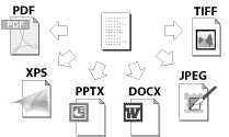 Für den Versand von Dokumenten werden unterschiedliche Dateiformate wie PDF, XPS, OOXML(pptx/docx), JPEG oder TIFF unterstützt. So können Sie Dokumente in dem Format versenden, das am besten zum Dokument und zur Verarbeitungsumgebung des Empfängers passt.