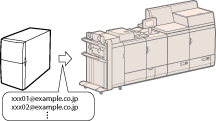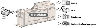 Das System kann so programmiert werden, dass empfangene I-Faxdokumente, die mit den festgelegten Weiterleitungsbedingungen übereinstimmen, automatisch mit den gewünschten Sendeeinstellungen an beliebige Empfänger weitergeleitet werden. Empfangene I-Faxdokumente können an ein anderes System weitergeleitet (Relaisfunktion) oder in einer vertraulichen Faxeingangsbox gespeichert werden. Sie können auch eine automatische Weiterleitung festlegen, die zu einem von Ihnen bestimmten Zeitpunkt aktiviert wird. Da Empfangsdokumente, die nicht den Weiterleitungsbedingungen entsprechen, ebenfalls an einen Empfänger Ihrer Wahl gesendet werden können, eignet sich diese Funktion auch zum Sortieren und Weiterverteilen von I-Faxsendungen an verschiedene Empfänger.