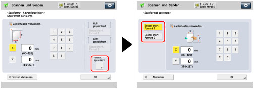 Sie können ein Scanformat manuell eingeben, wenn Sie Originale scannen, deren Format bei der Verwendung der Funktion [Auto Format] nicht erkannt wird. Sie können ein definiertes Scanformat auch speichern.