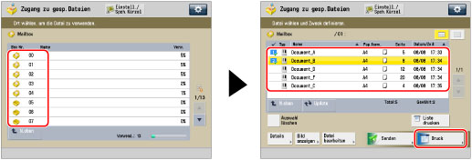 Wählen Sie die gewünschte Mailbox → Wählen Sie die gewünschten Dateien in der Reihenfolge, in der Sie sie zusammenführen möchten → Berühren Sie die Taste [Druck].