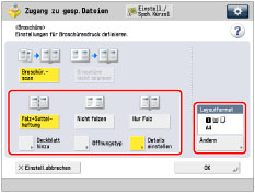 Berühren Sie die Taste [Öffnungstyp] → Wählen Sie das Endverarbeitungsformat → Berühren Sie die Taste [OK].