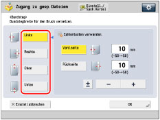 Wenn Sie die Funktionen <Bundsteg> und <Doppelseitiger Druck> zusammen verwenden und eine Datei drucken, die bereits einen Bundsteg hat, stellen Sie die Funktion <Bundsteg> nur für die Rückseite ein. Wenn Sie die Funktionen <Bundsteg> und <Doppelseitiger Druck> zusammen verwenden und eine Datei drucken, die keinen Bundsteg hat, stellen Sie die Funktion <Bundsteg> für die Vorder- und die Rückseite ein. Wenn Sie einen anderen Wert als 0 eingeben, können Sie durch Berühren der Taste [±] zwischen positiver und negativer Bundstegbreite umschalten. Beispiele: | (+)10 → [±] → -10 | | -50 → [±] → (+)50 |
