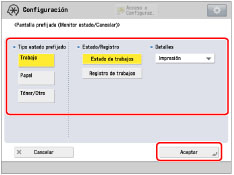 Si establece [Trabajo], [Estado de trabajos], [Impresión] como Pantalla prefijada (Monitor estado/Cancelar):
