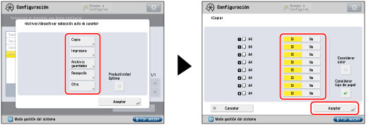 Puede establecer la selección automática de casete para bandeja de alimentación cuando la Opción de Alimentación para Originales de Longitud especial (Banners) A1 está instalada. (Consulte "Opción de Alimentación para Originales de Longitud especial (Banners) A1".) Al menos uno de los orígenes de papel, además de la Opción de Alimentación para Originales de Longitud especial (Banners) A1, debe ponerse en 'Sí'. Si selecciona [Copia], puede establecer el tener en consideración el modo de color. Si ajusta [Considerar color] a ''Sí, el origen del papel se selecciona automáticamente de acuerdo con el modo de color (por ejemplo, se selecciona papel para copia en color como papel normal cuando se copia en color, o se selecciona papel para copia en negro como papel reciclado cuando se copia en negro). Para más información, consulte "Especificar la selección automática de casete basada en color". Si ajusta [Considerar color] a 'No', el origen del papel no se seleccionará automáticamente de acuerdo con el modo de color. Se ajusta [Considerar color] a 'Sí', también se ajustará [Considerar tipo de papel] a 'Sí'. Si selecciona [Copia], puede establecer el tener en consideración el tipo de papel. Si ajusta [Considerar tipo de papel] a 'Sí', el papel no se alimenta desde otro alojamiento cuando se agote durante la impresión, a menos que haya papel del mismo tamaño y tipo cargado en otro alojamiento. Para más información acerca de los tipos de papel guardados, consulte "Comprobar el estado de los consumibles y otra información". Si ajusta [Considerar tipo de papel] a 'No', el papel se alimenta desde otro origen del papel cuando se agota durante la impresión, siempre que haya papel del mismo tamaño y tipo cargado en ese origen del papel. Si pulsa [Productividad óptima], el origen de papel cambiará automáticamente antes de que finalice completamente el papel, y la alimentación de papel continuará sin interrumpirse. Si selecciona [Impresora], puede establecer orígenes de papel como un grupo. Si ajusta [Usar grupo] a 'Sí', los orígenes del papel se establecen como un grupo. Si selecciona un origen de papel específico en el controlador de impresora, Cambio automático de casete se ejecuta en el grupo. Si ajusta [Usar grupo] a 'No', los orígenes del papel se establecen como un grupo. Si selecciona un origen de papel específico en el controlador de impresora, Cambio automático de casete no se ejecuta. |
