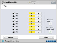 [Considerar tipo de papel] | Si el origen del papel se queda sin papel durante un trabajo de copia, se seleccionará otro origen del papel como resultado del cambio automático de casete. Si se activa, los orígenes del papel con diferentes tipos de papel no se seleccionarán incluso aunque estén cargados con el mismo tamaño de papel. |