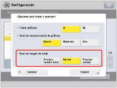 [Normal]: | El tamaño de datos y la calidad de imagen del fondo están entre los de [Priorizar tamaño datos] y [Priorizar calidad]. |