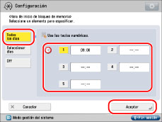 Si selecciona [Todos los días], seleccione un número ([1] a [5]) → introduzca la hora de inicio con